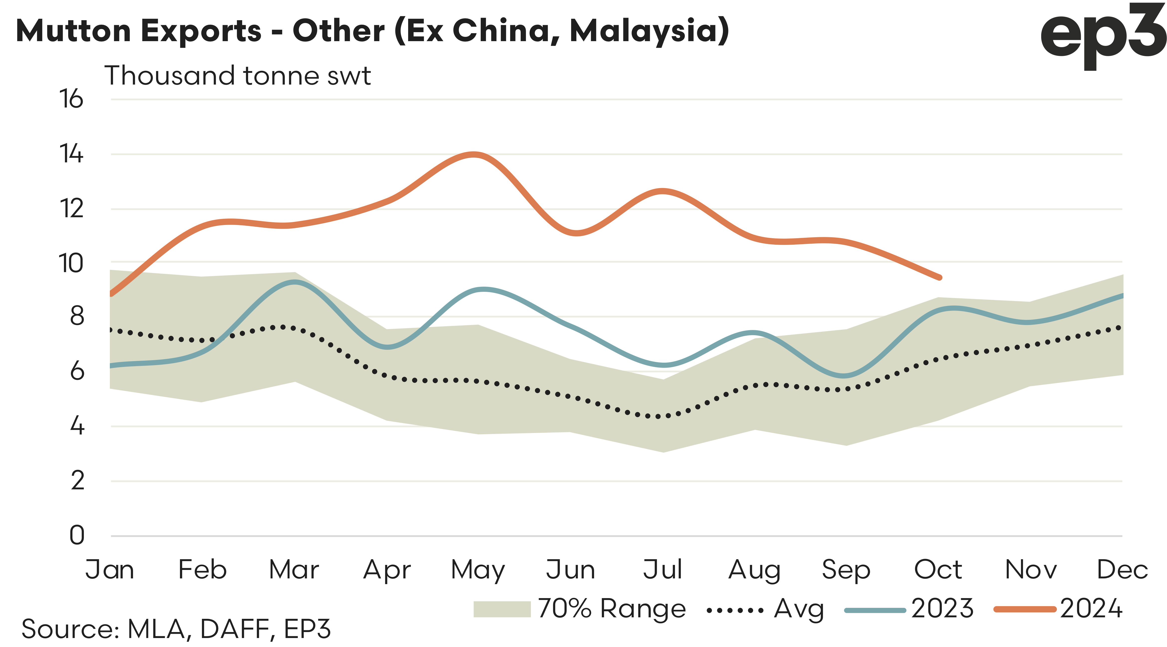 The others – Mutton flows to the “others” (excluding China and Malaysia) softened by 12% during October. There was 9,440 tonnes reported shipped over the month. While this is a softening in the trade these levels still represent pretty strong October flows on a historic basis though as volumes are still 14% higher than October last year and nearly 45% above the October five-year average flows.