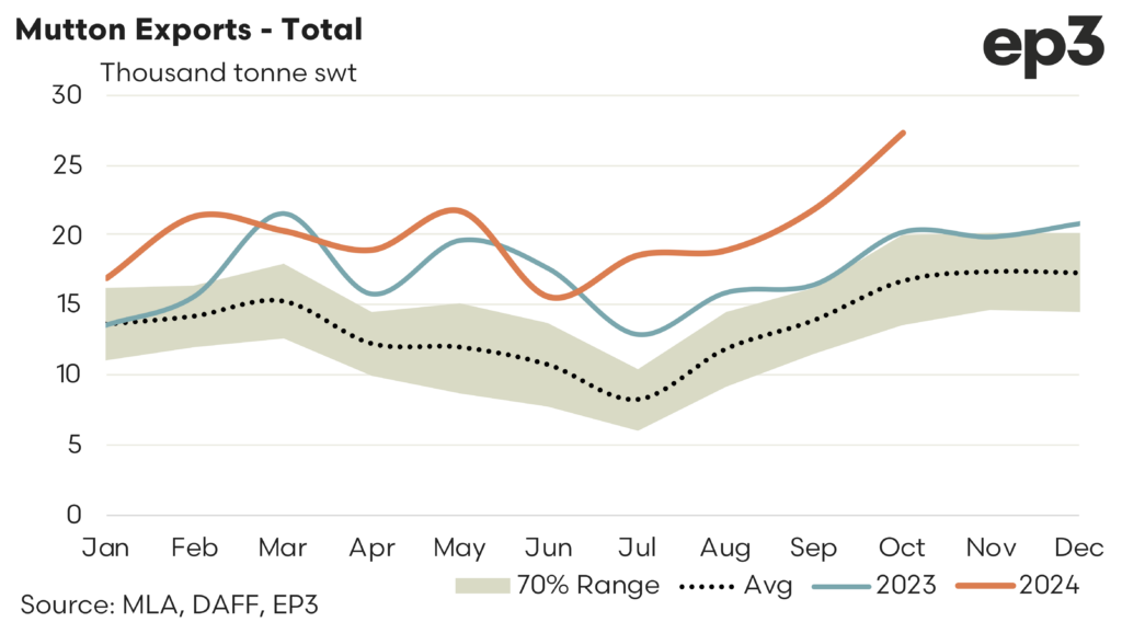Compared to the September 2024 export volumes October saw a 25% lift in the total mutton trade out of Australia and the current export volumes are running 35% higher than the levels set during October 2023 and nearly 63% above the average October volumes, based on the last five years of the trade.