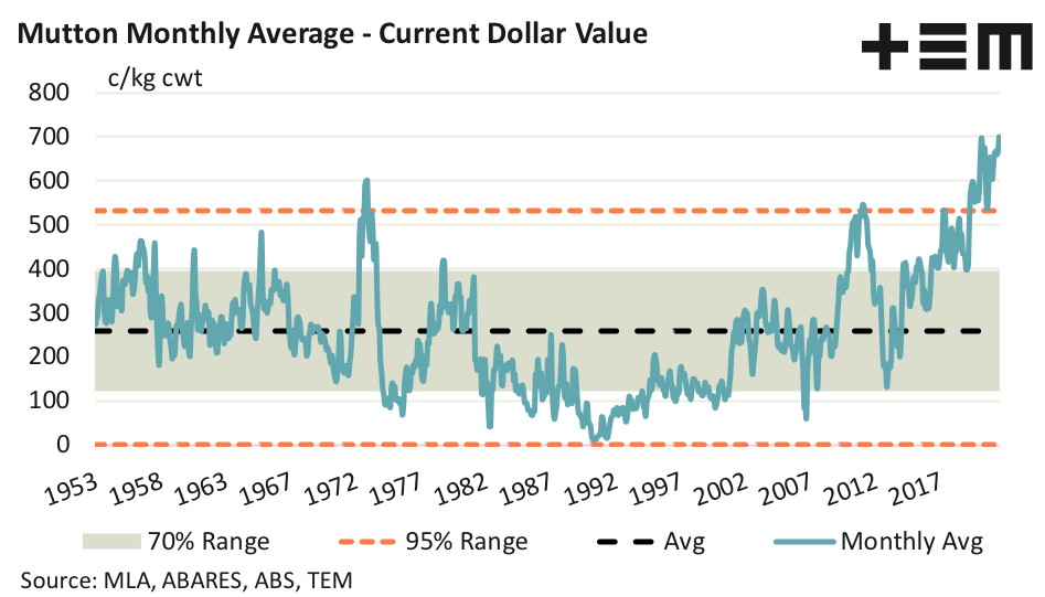 - Mutton prices above 530c/kg cwt would be considered extreme, based on the last seven decades of deflated price data.