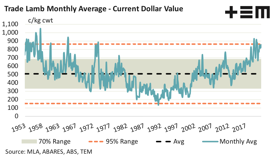 - National Trade Lamb prices have just tipped into extreme territory this week edging past 860c/kg cwt. However, there is a way to go yet before it reaches the inflation adjusted high of 1,049 cents seen in 1957.