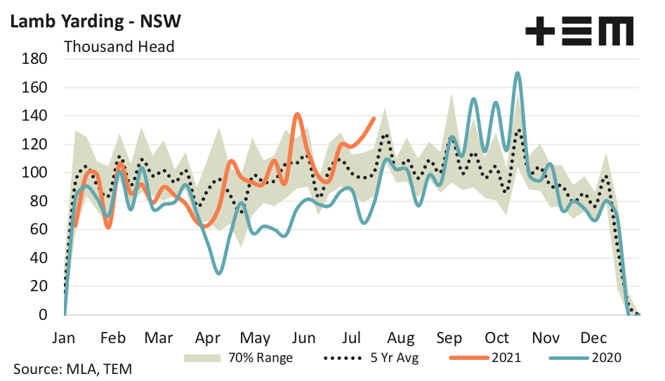 Weekly NSW lamb yarding showed some vigour too, with the 138,256 head reported accounting for a 10% gain on the week prior. This make for the highest weekly lamb offering in NSW in seven weeks and is just 2,669 head shy of the biggest weekly lamb yarding in NSW seen in 2021.