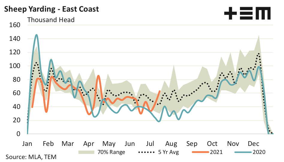 The solid surge in sheep and lamb numbers in NSW have provided support to the east coast throughput levels with east coast sheep yarding pushing above the average trend for the first time since April. There were 62,693 head of sheep presented at east coast sale yards for the week ending 16th July, placing the east coast sheep sale yard volumes 42% higher than the five-year trend for this week in the year.