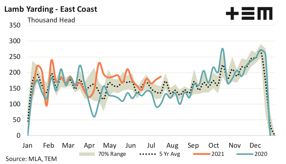 East coast lamb yardings saw 186,963 head reported for the week ending on July 16th, which was a 5% increase on the previous week. Lamb throughput of this magnitude represents levels that are 36% ahead of the average seasonal pattern.