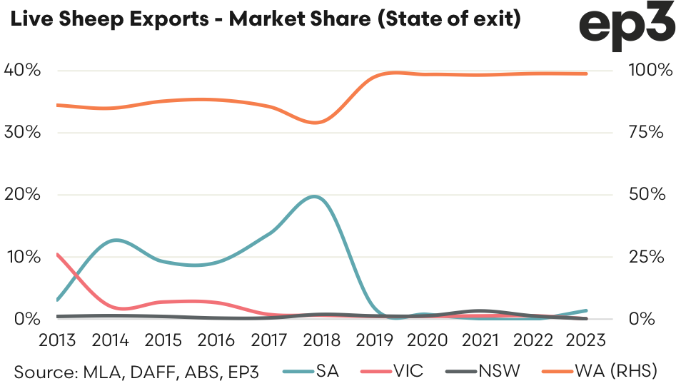 However, February saw the market dry up with no export flows leaving Western Australian ports. Just 408 sheep were transported via air from the eastern states, compared to the 99,160 head that left Fremantle in January. Since 2019 the proportion of live sheep exiting the country from WA is more than 98% of the trade and 2023 has started with similar proportions of live sheep coming solely from the west.
