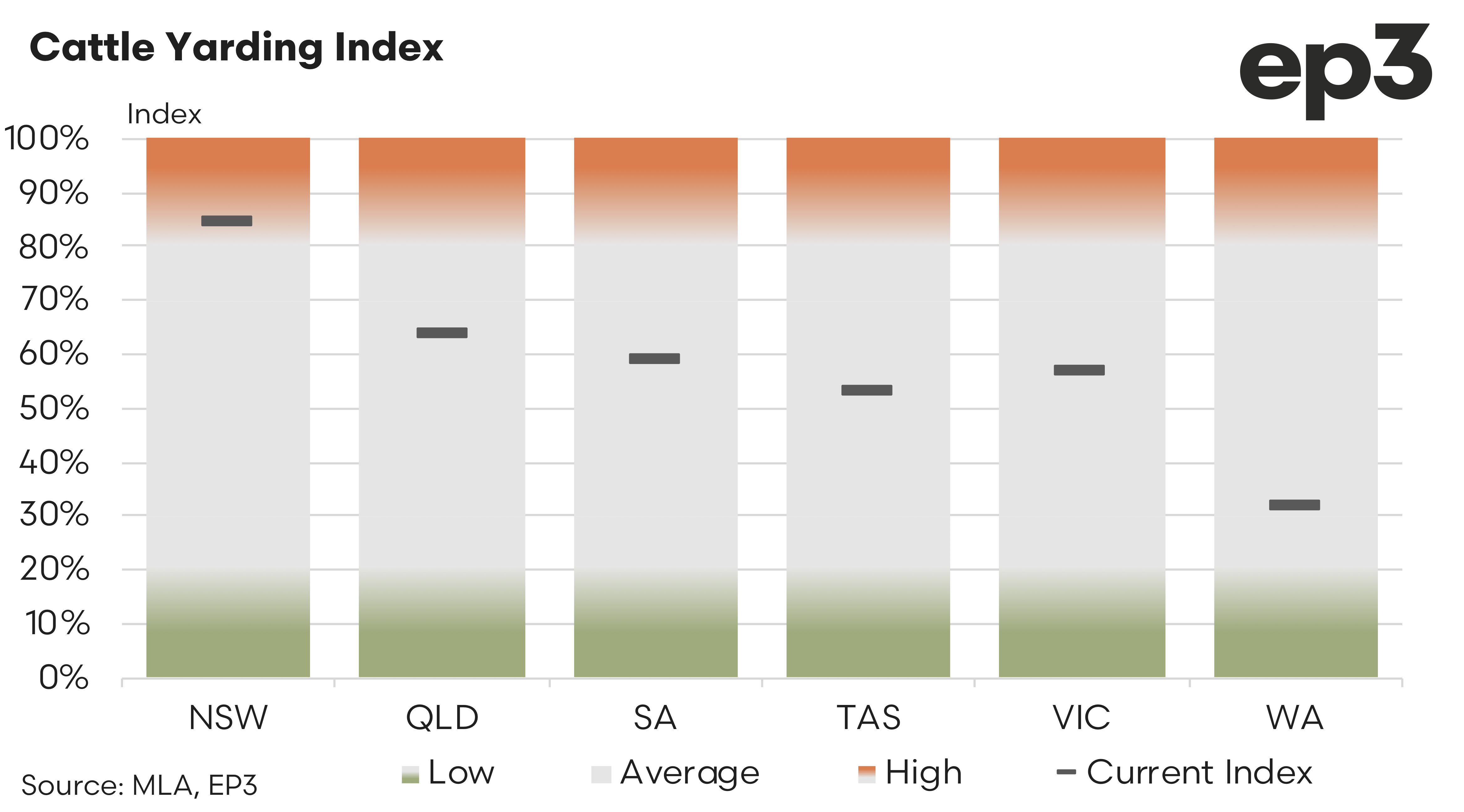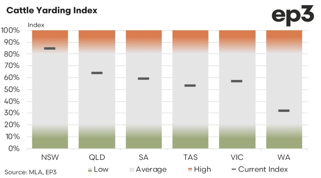 The cattle slaughter index in Victoria sits at 87% whereas the equivalent measure of Victorian cattle saleyard throughput sits at just 57%, somewhat confirming the anecdotal reports from industry that sale yard cattle supply in the south is not keeping up with processor demand, thus necessitating the northern search for available cattle.