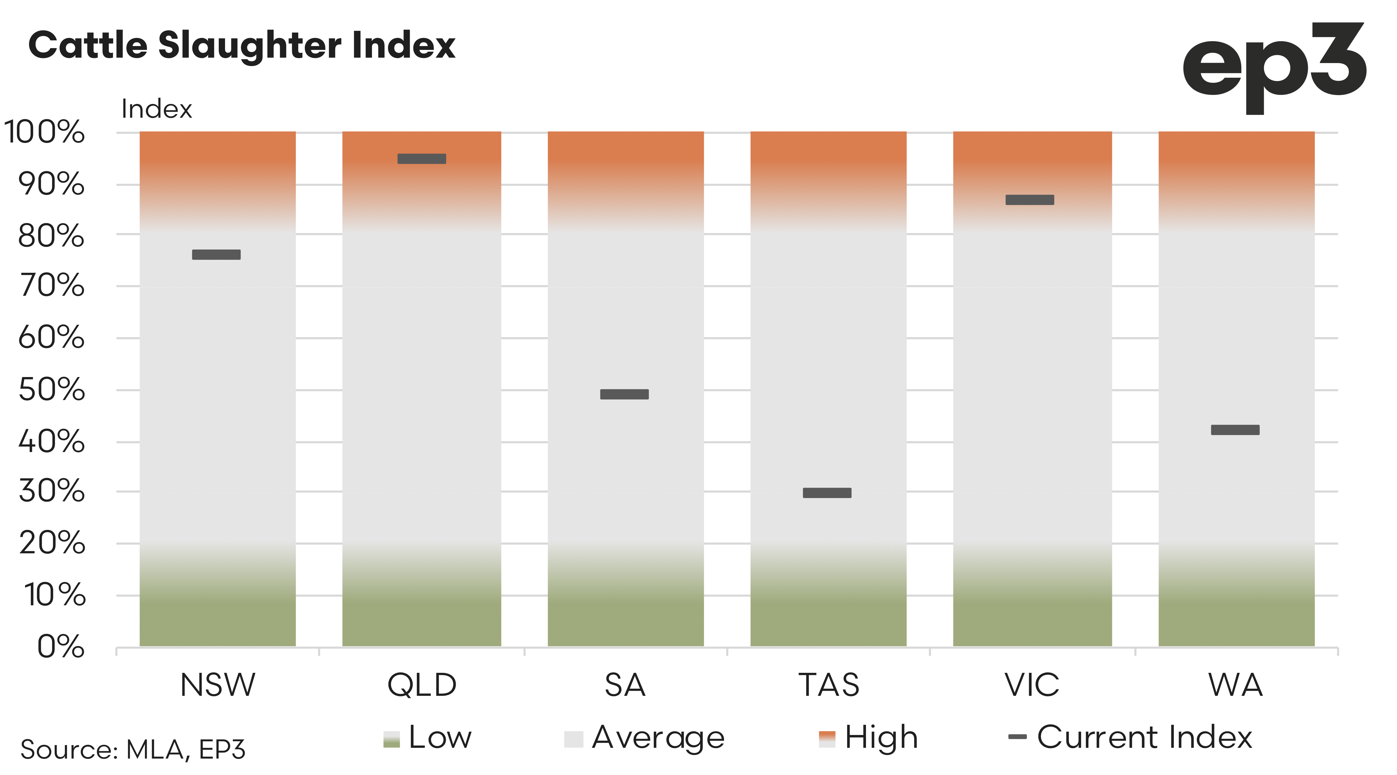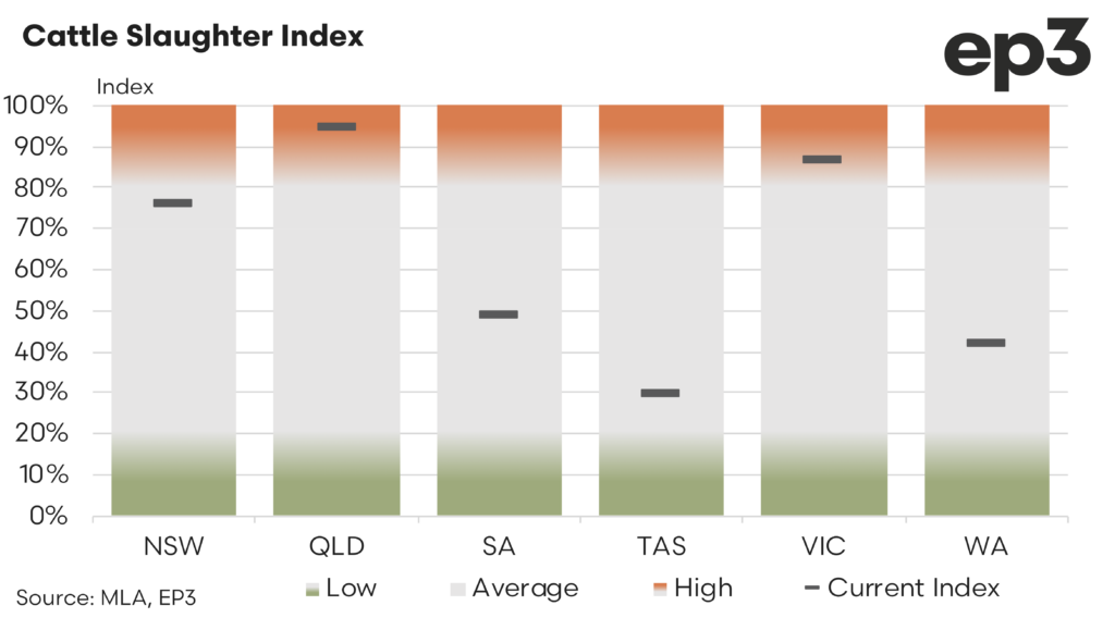 Warmer weather in Queensland has led to an increase in cattle supply, particularly from northern and western regions, contributing to processors lowering grid prices by around 10 cents per kilogram. The weekly cattle slaughter index in Queensland currently sits at 93%, which indicate that current weekly cattle processing volumes in Queensland abattoirs are higher than 93% of weekly records since the start of 2019.