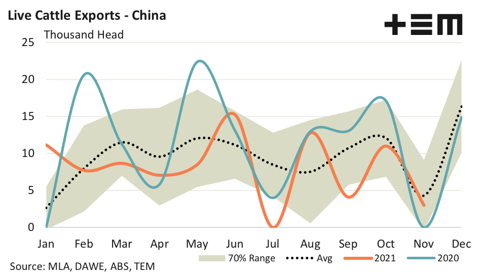 Live cattle flows from Australia to China dipped by around 70% over November to see 3,000 head reported shipped. However, as the five-year average trend highlights it is not uncommon to see reduced flows in November. The current volumes to China sit around 30% under the five-year average for this month in the season.