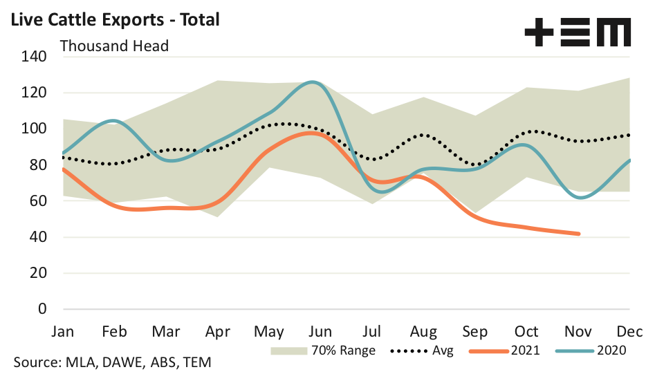 Since September monthly volumes have been trending well under the normal range that could be expected, according to the usual monthly variations seen over the past five seasons. November 2021 is no exception with live export trade volumes running 55% below the five-year average for November.
