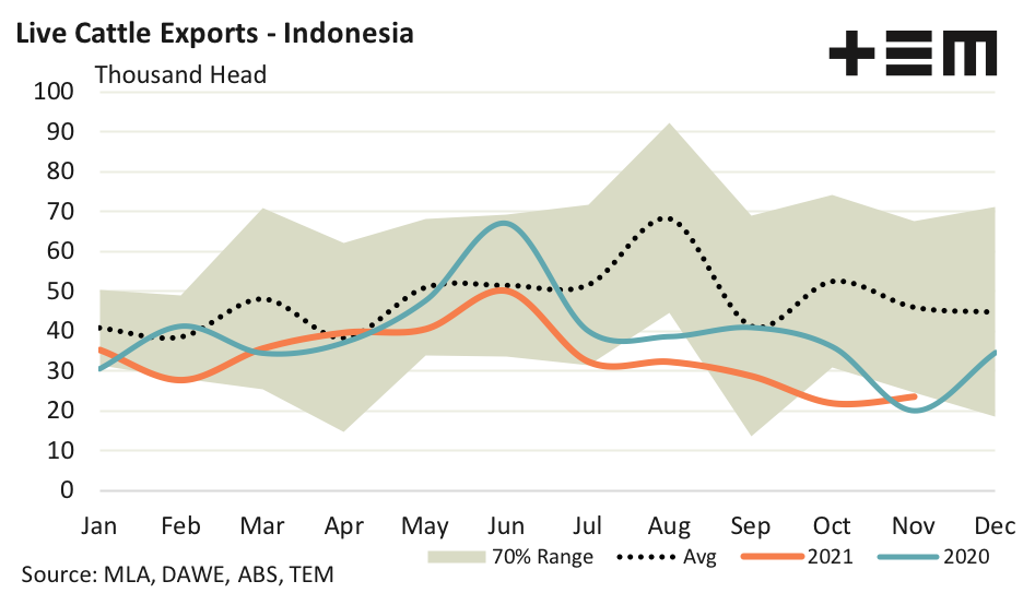 - Live cattle exports to Indonesia are 49% below the five-year average pattern for November.
