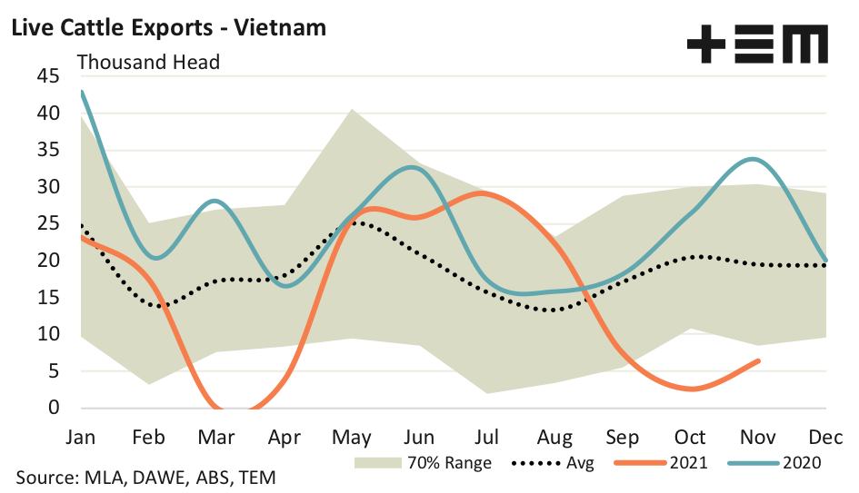 Vietnamese demand for Aussie live cattle continues to be lacklustre as shipments from South America crowd us out. November saw just 6,353 head transported to Vietnam from Australia, while this was a big increase from the 2,542 seen during October it is still nearly 70% short of the 19,500 odd we have seen shipped to Vietnam during November, as an average over the last five years.