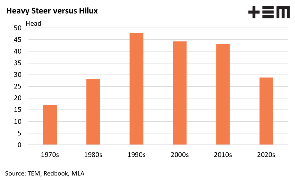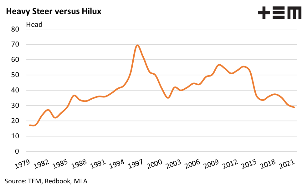 Currently, it takes the sale of around 30 head of steer to buy a Hilux, which is the lowest it has been on a decade average basis since the 1980s.