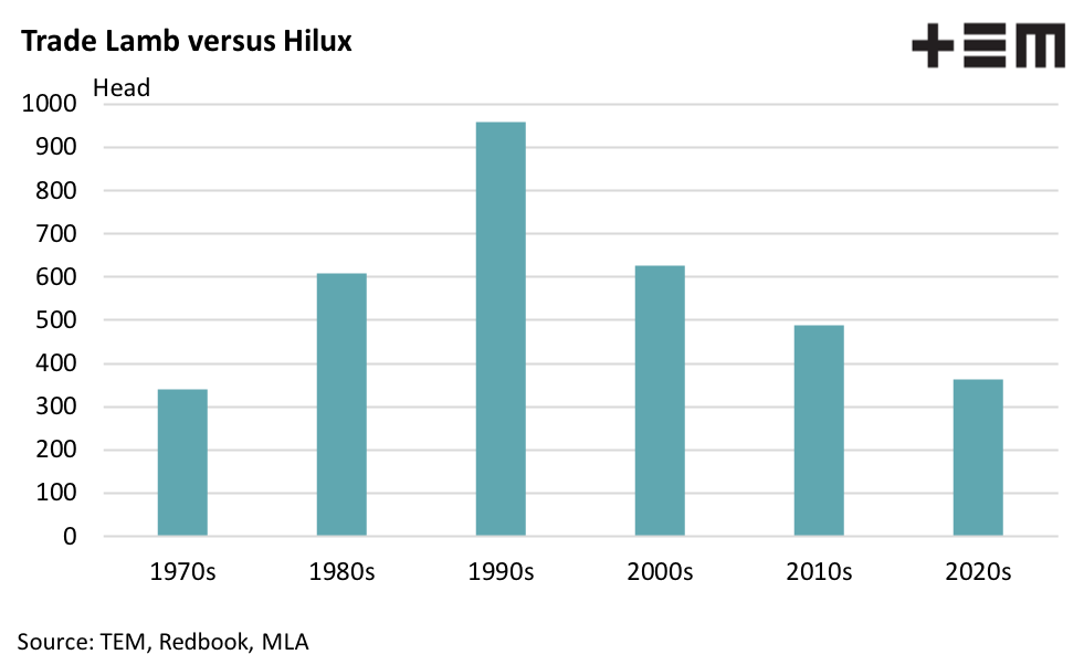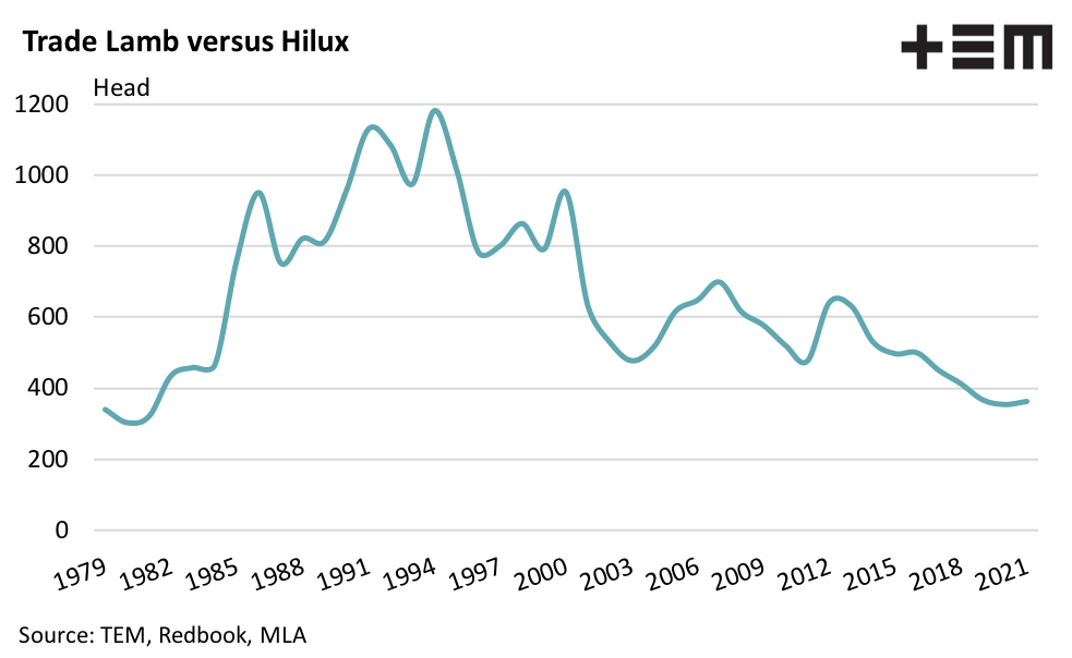 - In recent years the trade lamb has been able to claw back some ground to the Hilux to see the ratio move back to where it began in the late 1970s, with less than 400 head of trade lambs required to be sold to buy a Hilux.