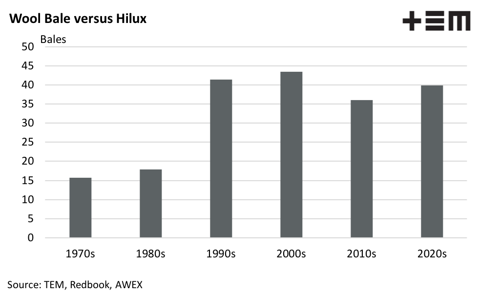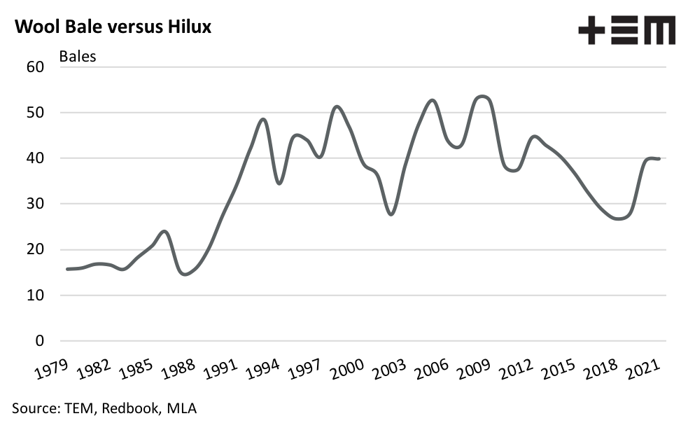 - The strong rally in wool prices during the 2018/19 seasons saw the bale to Hilux ratio dip below 30. However, by 2021 wool had returned to the 40 odd bales required to buy a Hilux that had been the decade benchmark since the 1990s.
