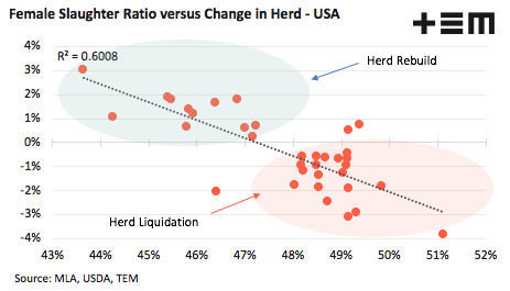 When the FSR ratio dips below 47%, as it did earlier this season in Australia, it signifies that the herd has begun a rebuild phase. Interestingly, analysis of the thresh hold between herd liquidation and rebuild within the USA mirrors the Australian experience with a tipping point between liquidation and rebuild in the USA also at around 47%. Indeed, analysis of the annual herd change in the USA compared to the annual average FSR from 1986 shows a moderately strong correlation between the two series with a correlation coefficient of 0.6008 and annual FSR levels above 47% often coinciding with US herd decline.