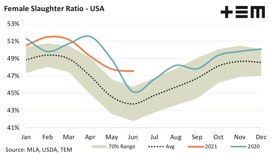 The seasonality chart for the FSR in the USA shows that the 2021 pattern is running above the normal range and well above the average seasonal trend. The average FSR for 2021 (January to July) is sitting at 49.6% in the USA, which is the highest annual average FSR since 1997. In 1997 the FSR in the USA averaged 49.8% and this lead to a decline in the US herd that year of 1.8%.