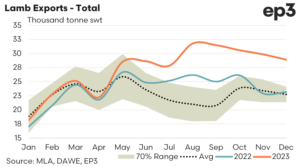 There was 28,926 tonnes of Australian lamb exported offshore during December 2023, reflecting a mild 3% easing from the very strong levels seen in November. Although December saw slightly lower lamb export volumes it was still the best December result on record for Aussie lamb exports with trade flows running 27% above the five-year average for December and it capped off an exceptional year for the trade.