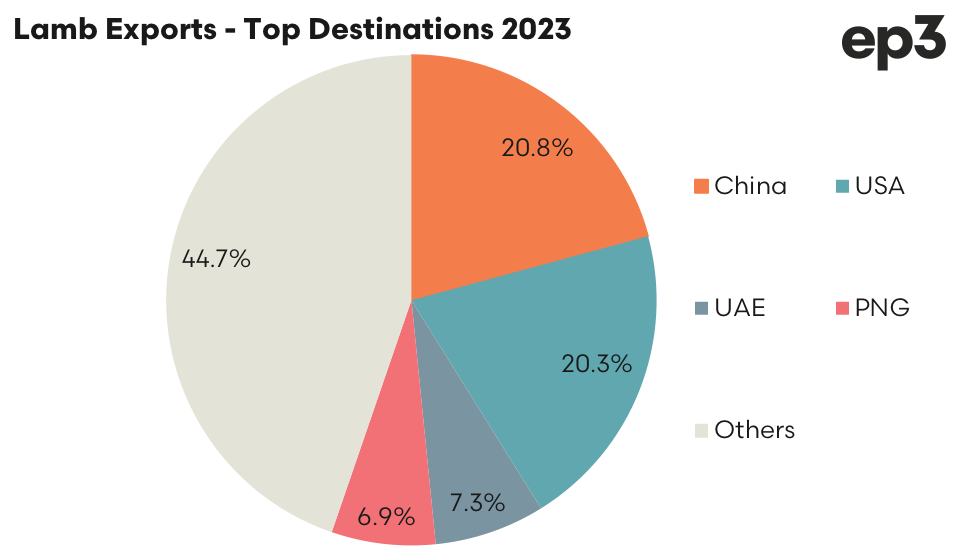 In total there was 326,013 tonnes swt of Aussie lamb exported offshore in 2023, a new annual record volume and nearly 15% higher than the previous record year seen during 2022 when there was 284,256 tonnes of lamb exported. China managed to sneak past the USA for top trade destination with 20.8% of the trade compared to the 20.3% that the USA accounted for during 2023. The United Arab Emirates (UAE) held onto third top destination with 7.3% and Papua New Guinea (PNG) was placed fourth accounting for 6.9% of total lamb export volumes from Australia.
