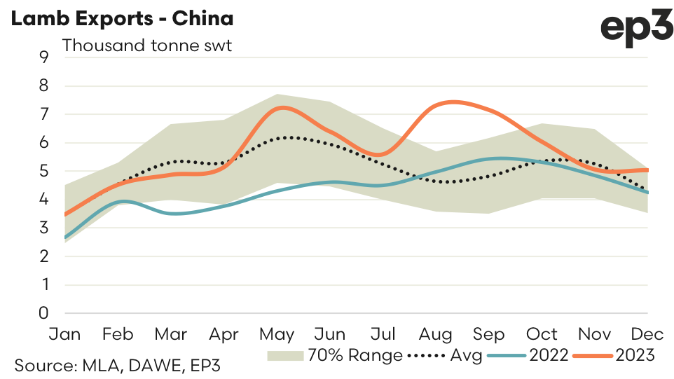 China – December 2023 saw relatively steady Aussie lamb export volumes to China with 5,031 tonnes reported exported from Australia, just 26 fewer tonnes shipped than in November. The December 2023 lamb export volumes representing trade levels that are nearly 17% higher than the five-year average for December. In total China took 67,763 tonnes of Australian lamb during 2023 which is the second highest annual volumes on record, around 5% below the 71,223 tonnes reported shipped during 2019.