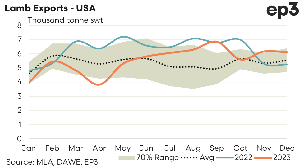 USA – There was 6,117 tonnes of lamb exported from Australia to the USA in December 2023, just 50 tonnes fewer than the November trade levels. Compared to the five-year average volumes for December the current flows are 10% higher. During the entire 2023 season there was 66,320 tonnes of Aussie lamb exported to the USA, which equates to the third highest annual volumes on record.