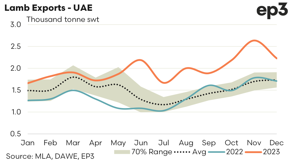 UAE – Aussie lamb export flows to the UAE dipped by 16% during December 2023 to see 2,227 tonnes traded for the month. Despite the decline this still represents trade levels that are 28% higher than the five-year average for December. For the 2023 year the UAE took a total of 23,764 tonnes of Australian lamb exports which is a new annual record volume. Compared to the previous record of 20,904 tonnes set in 2016 the current trade levels are 14% higher.