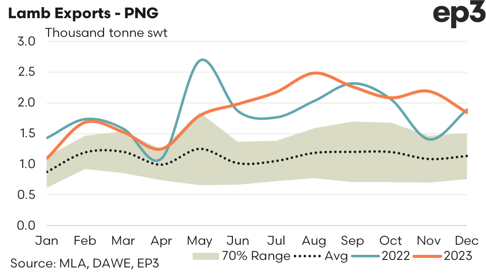 PNG – Papua New Guinea took 1,841 tonnes of Australian lamb exports during December 2023, a 16% drop from the levels shipped during November 2023. This was similar to the trade levels seen during December 2022 but 62% higher than the December average trade levels, according to the last five-years of the trade. In total during 2023 PNG shipped in 22,340 tonnes of Australian lamb product making the 2023 season a new annual record for lamb exports, with flows 2% higher than the previous record year of 21,900 tonnes set in 2022.