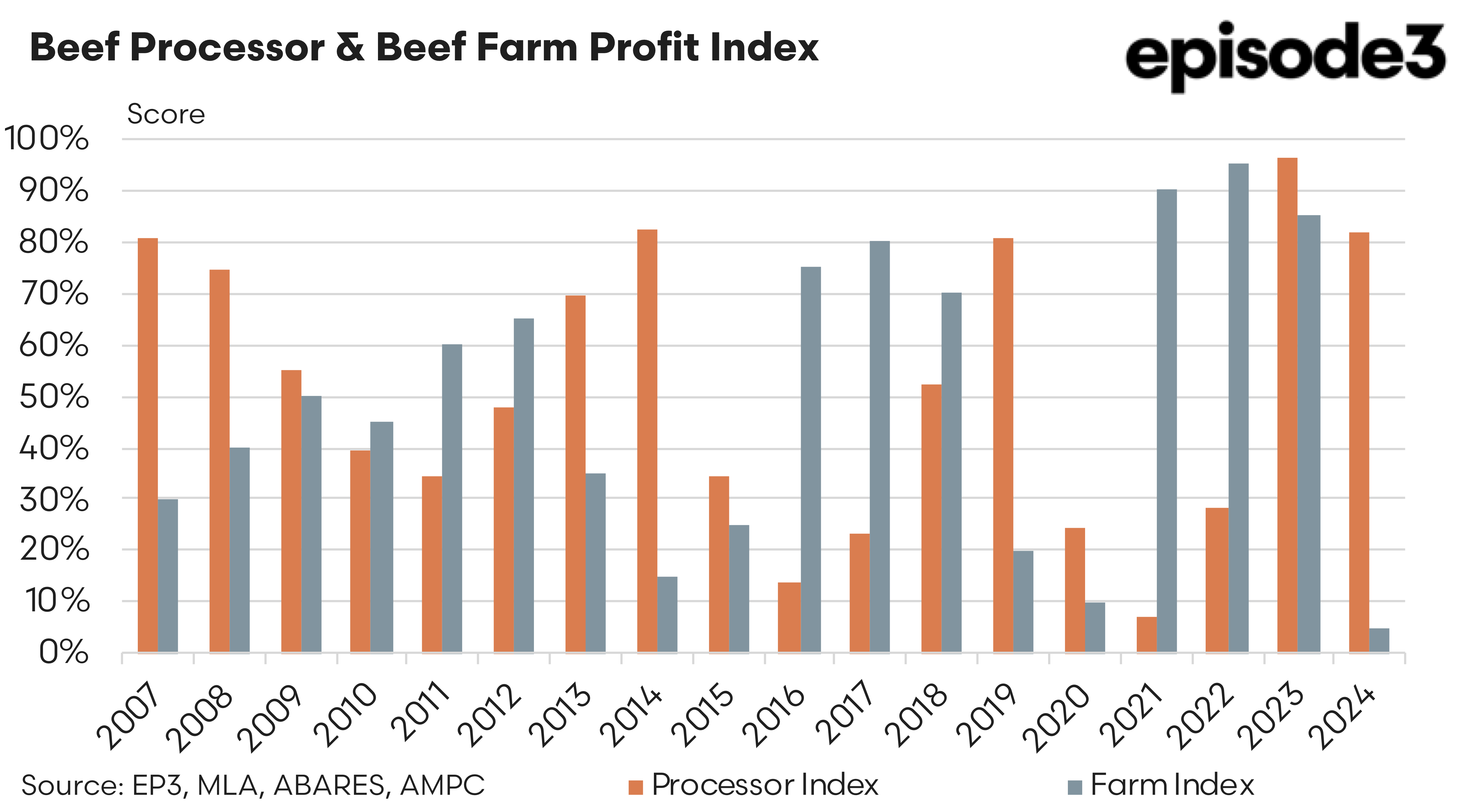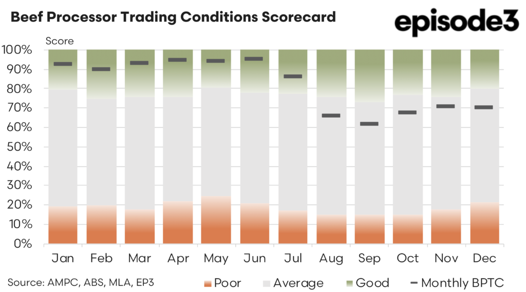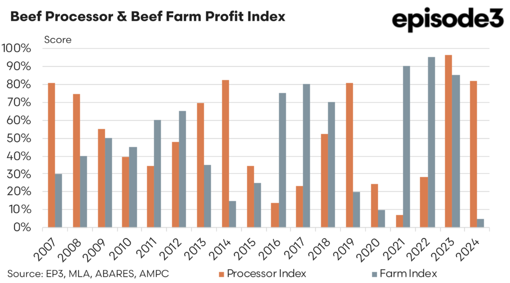The index reached an annual score of 82%, signifying that the conditions experienced by beef processors in 2024 were superior to those encountered in 82% of the historic records since 2007. This high score reflects a robust trading environment for processors, likely driven by favourable market dynamics due to the tight supplies and high prices evident in Australia’s biggest beef export destination and most important beef trade competitor – the USA.