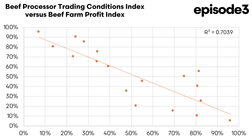 A detailed examination of the BPTC’s relationship with beef farm profitability reveals a complex interplay. The strong negative correlation between these two indices, evidenced by an R-squared value of 0.7039, indicates that approximately 70% of the variance in farm profitability annually can be explained by fluctuations in processor trading conditions. This inverse relationship suggests that improved conditions for processors tend to precede lower profitability for farms, and vice versa. This correlation could be influenced by factors such as market pricing, the status of the cattle herd rebuild/liquidation cycles, and external economic conditions affecting both ends of the beef supply chain differently.