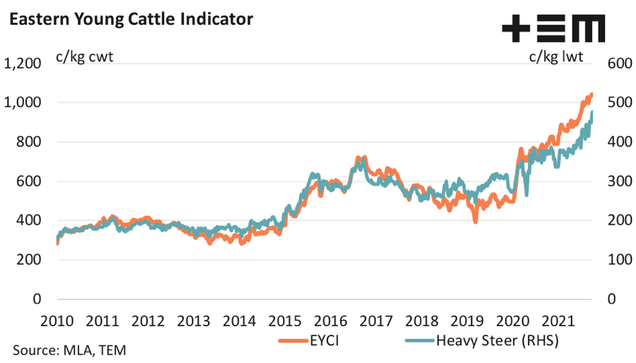 Both the Eastern Young Cattle Indicator (EYCI) and the National Heavy Steer price have hit all time peaks as September 2021 came to a close. The EYCI at 1042 cents/kg carcass weight (cwt) and the National Heavy Steer surging 35 cents in a day to trade at 475 cents/kg live weight (lwt).