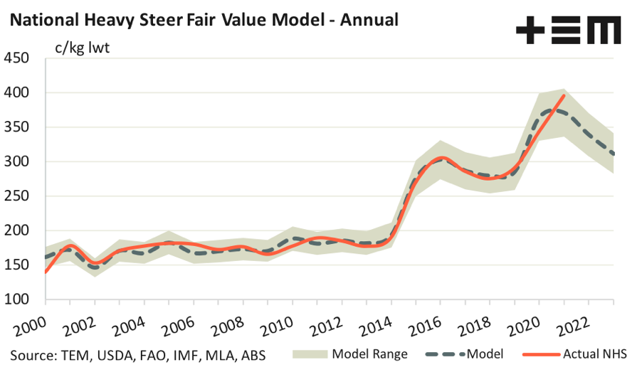 - Currently, for the 2021 season EP3 modelling shows an average annual price of 375 cents/kg lwt is fair value for the National Heavy Steer. As of the end of September the actual annual average was 395 cents.