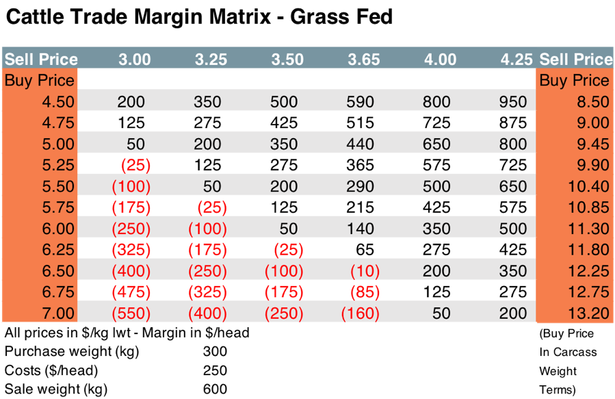 The matrix below shows the potential outcome of this grass-fed trade, in dollars per head profit or loss, at a variety of price entry and exit points. Buying young cattle at the current EYCI level of 10.40 $/kg cwt, or 5.50 $/kg lwt and selling in 2022 at the fair value model annual average estimate of 3.50 $/kg would bring a profit of $200 per head.