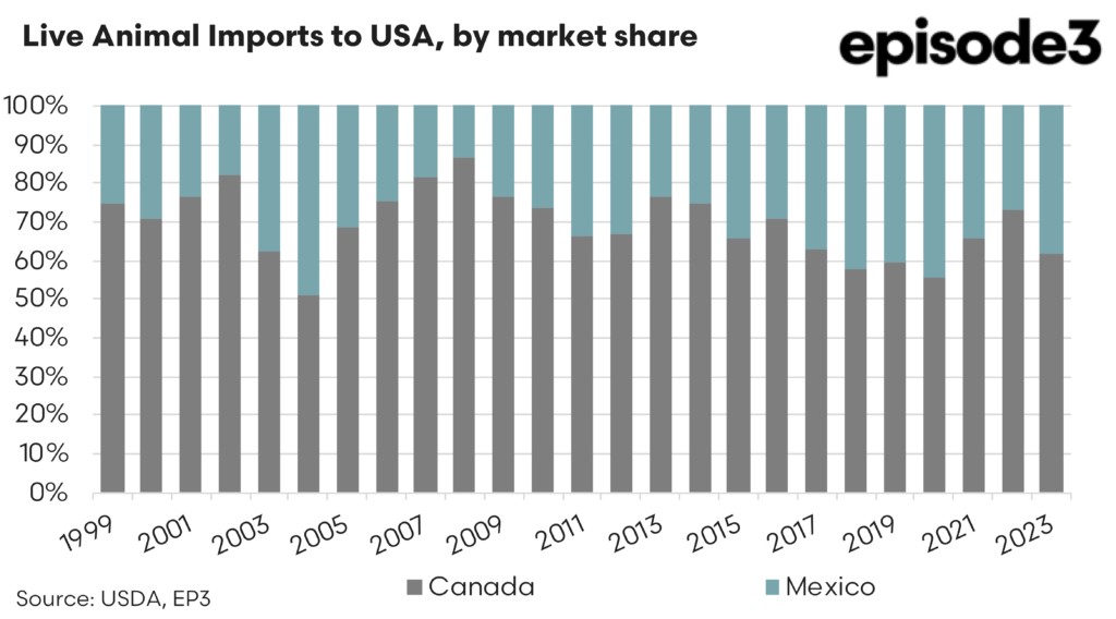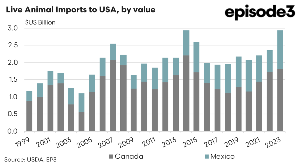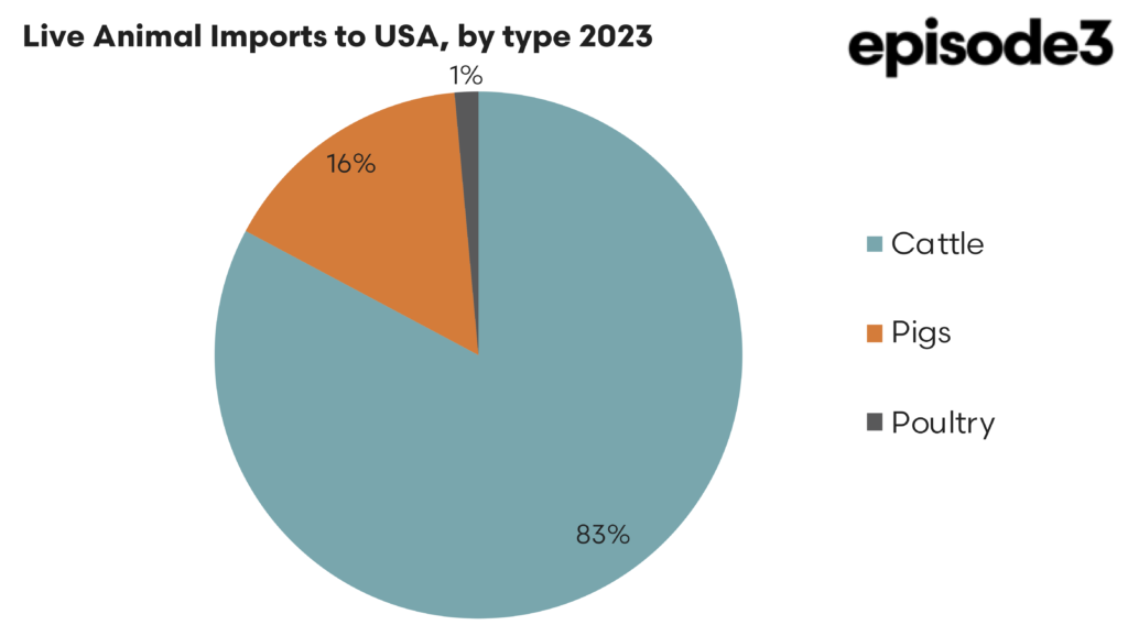 In terms of type of livestock imported into the USA, the trade is dominated by cattle and then pigs. In 2023 United States Department of Agriculture (USDA) data highlights that, by value, 83% of animals transported into the USA were cattle and 16% were pigs. Only 1% of the trade value was for poultry. There is also a very small trade of sheep & goats but it is only around 0.04% of the value so we elected to exclude this from the chart as it isn’t that visible on the visual when added.