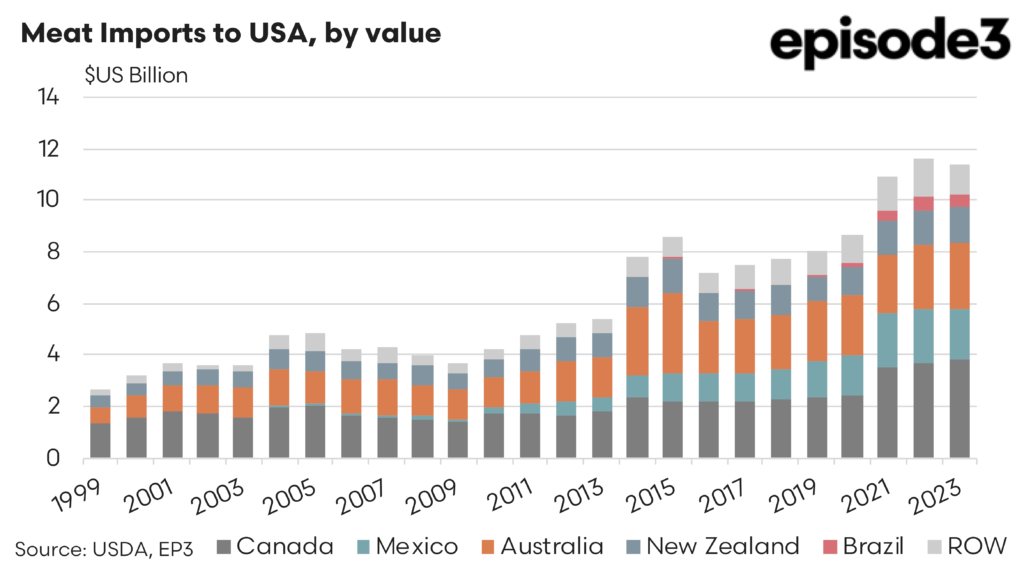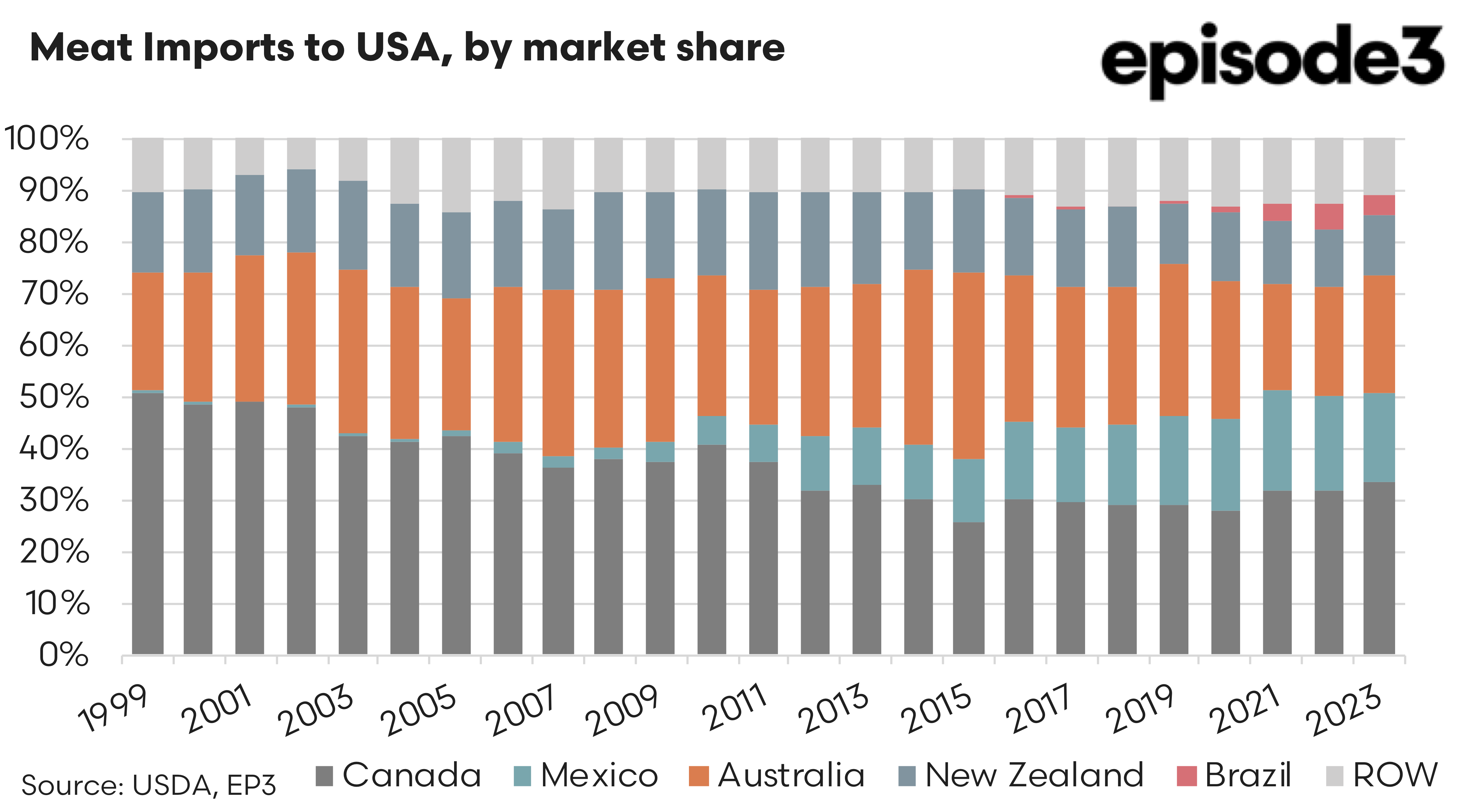 Taking a look at the market share of the meat trade by source country we can see that Canada and Mexico feature heavily with each country accounting for $US3.8 billion and $2 billion of the total meat trade in 2023, respectively. In terms of market share of the total meat trade into the USA, Canada sits in top spot with a 33.2% share last year and Mexico in third top position with 17.4% of the trade. Interestingly Australia hold the second top spot with nearly 23% of the trade with a trade value of $US2.6 billion in 2023. The Kiwis also feature prominently in 4th spot with $US1.3 billion or around 12% and in recent years Brazil has begun to capture some market share with $US478 million of trade flows in 2023, or around 4% of the total trade.