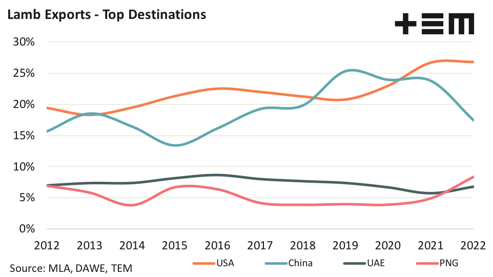 The USA and China are ahead of PNG in terms of market share of Australian lamb exports and both nations saw a gain in demand over February. Aussie lamb exports to the USA climbed 11% over February to see 5,339 tonnes consigned. Despite this lift, lamb exports from Australia to the USA are running nearly 8% below the average trend seen over the last five years.