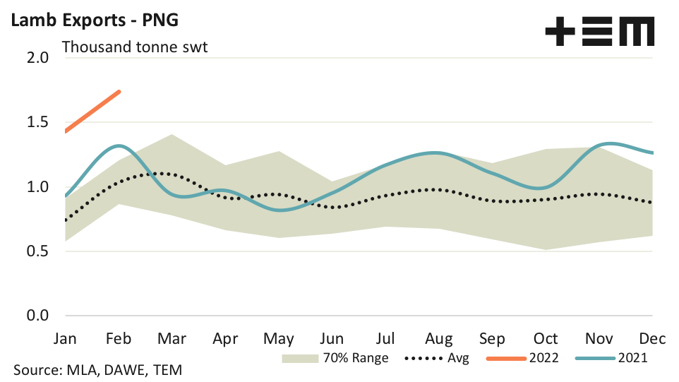 Papua New Guinea (PNG) continues to demonstrate strong demand for Aussie lamb in February, lifting to the third top destination in 2022 at 8.4% of the market share of total lamb exports. This growth in demand from PNG is already coming off strong flows seen in January. The Department of Agriculture, Water and Environment (DAWE) trade figures released today highlight that PNG saw a 21% increase in lamb imports from Australia taking the February total to 1,738 tonnes swt. This represents levels that are 68% higher than the five-year average for February.