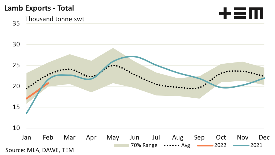 In terms of total lamb exports, February saw 20,774 tonnes exported offshore from Australia. This is nearly a 22% lift from levels seen at the start of 2022 and are about 9% under the average seasonal pattern for February, according to the five-year trend.