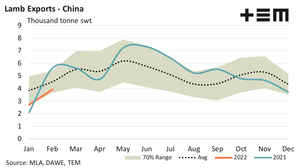 - Meanwhile Aussie lamb exports to China were up by 46% on the January levels, but remain 13% under the seasonal trend for this month in the year.