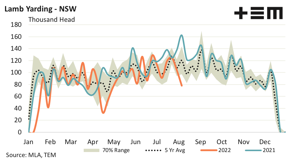 - NSW lamb slaughter volumes have lifted nearly 22% from mid-July to see around 114,000 head processed as at the end of July.
