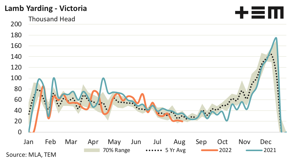 - Meanwhile, Victorian lamb saleyard throughput is nearing the seasonal winter lows near to 20,000 head per week.