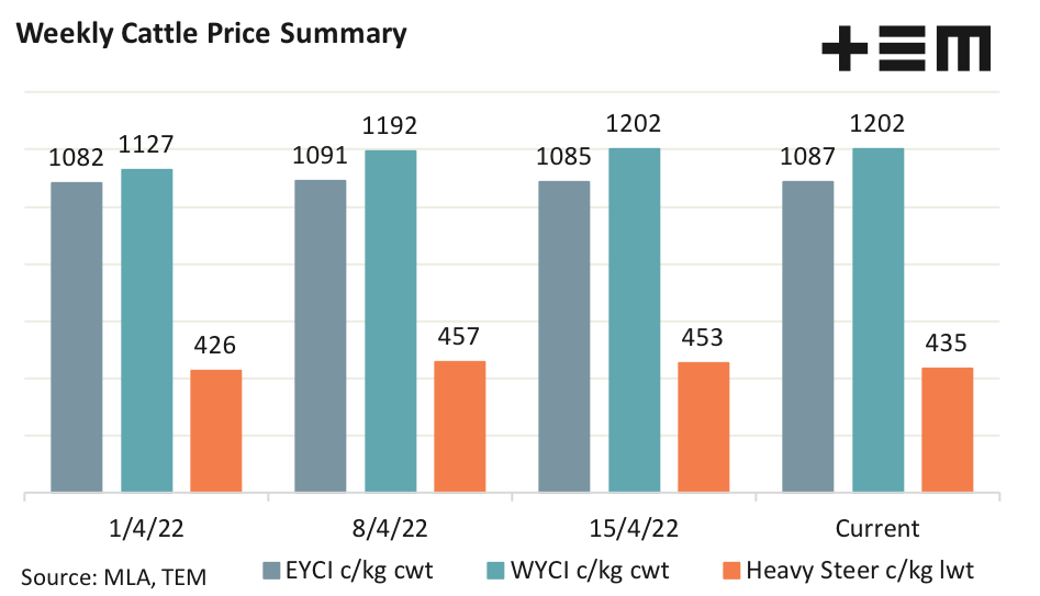 Reduced processor activity over the Easter break has flowed through to lower finished cattle prices with the National Heavy Steer easing 4% this week. As of yesterday the Heavy Steer was 435 c/kg lwt, down from 453 cents the previous week.