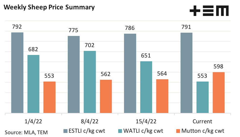 The Eastern States Trade Lamb Indicator (ESTLI) saw a marginal lift of 0.6% to 791 c/kg cwt, up from 786 c/kg. In the West there were limited sales and the thin markets saw a strong 15.1% decline in the WA Trade Lamb Indicator (WATLI). The WATLI staged a fall from 651 c/kg cwt to close at 553 c/kg earlier this week at the Katanning sale.
