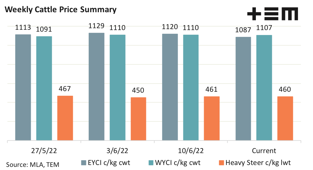 Young cattle prices on the east coast eased 3% on the week to close at 1087 c/kg cwt as at Thursday 16th June. In the west young cattle prices have remained stable for the last three weeks, falling just 3 cents this week to 1107 c/kg cwt. The National Heavy Steer has also managed a stable performance, posting just a 1 cent decline from last week to finish at 460 c/kg lwt.