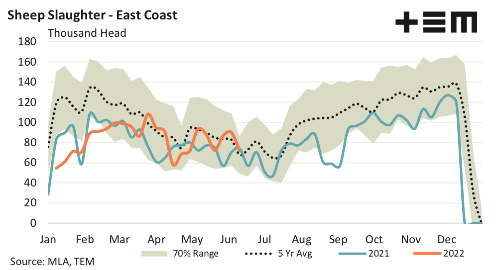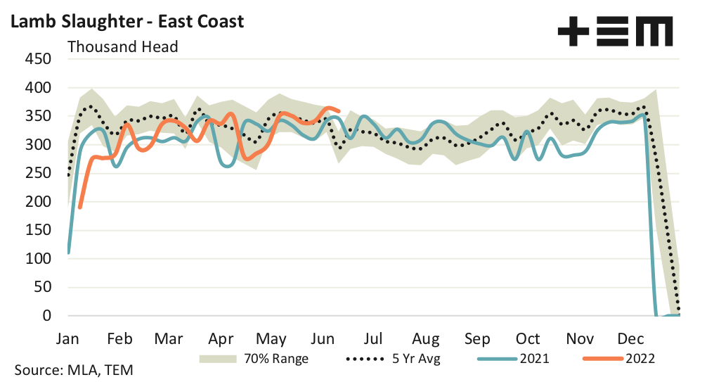 East coast lamb slaughter for the week ending 10th June remained strong at 358,384 head which is replicating the large east coast yarding numbers seen last week. East coast lamb slaughter is running at levels that are 21% above the five-year pattern for this week in the season. Meanwhile, east coast sheep slaughter volumes sit 6% above the five-year trend for this week in the season with 71,987 head reported for the week ending 10th June.