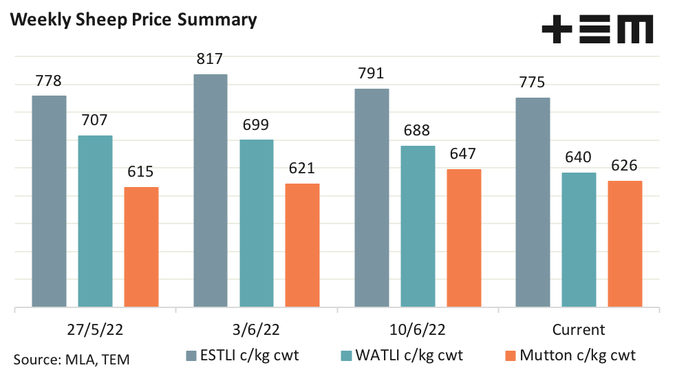 Large east coast yarding of lambs have kept pressure on the Eastern States Trade Lamb Indicator (ESTLI) with prices declining by 2%. The ESTLI sits at 775 c/kg cwt as at 16th June. Volatile price moves have continued for trade lamb prices in the West with the WATLI dropping 7% over the week to close at 640 c/kg cwt. The National Mutton Indicator declining too over the week, down 3% to 626 c/kg cwt.