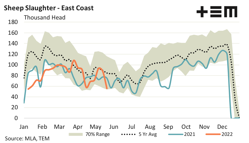 NSW lamb slaughter volumes dropped 10% on the week, for the week ending 20th May. Meanwhile, Victorian lamb slaughter levels only registered a 2% fall over the week.