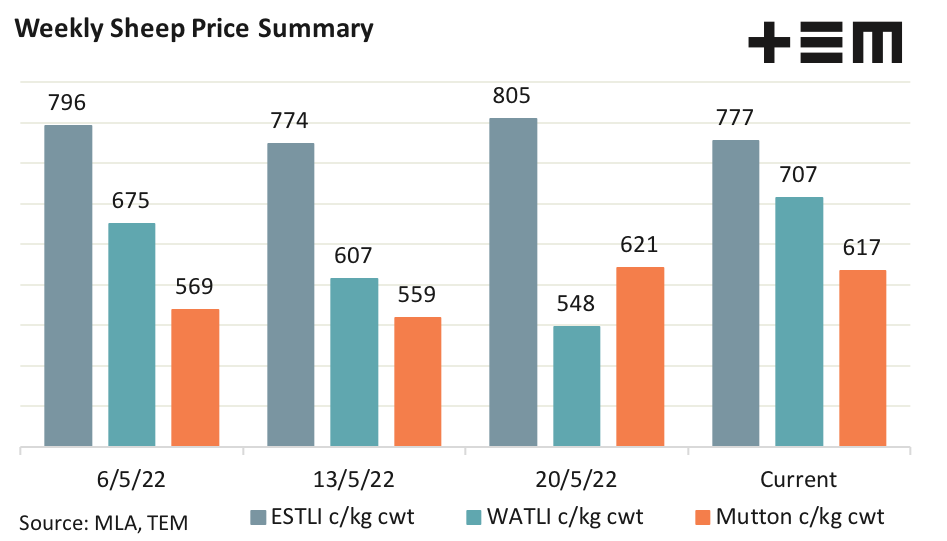 The Eastern States Trade Lamb Indicator (ESTLI) continues to see-saw around 800 cents, dropping 3.5% this week to close at 777c/kg cwt. The volatility in the eastern indicator movement is nothing compared to what has been displayed in the west with the WATLI lifting 29% to finish yesterday at 707c/kg cwt.