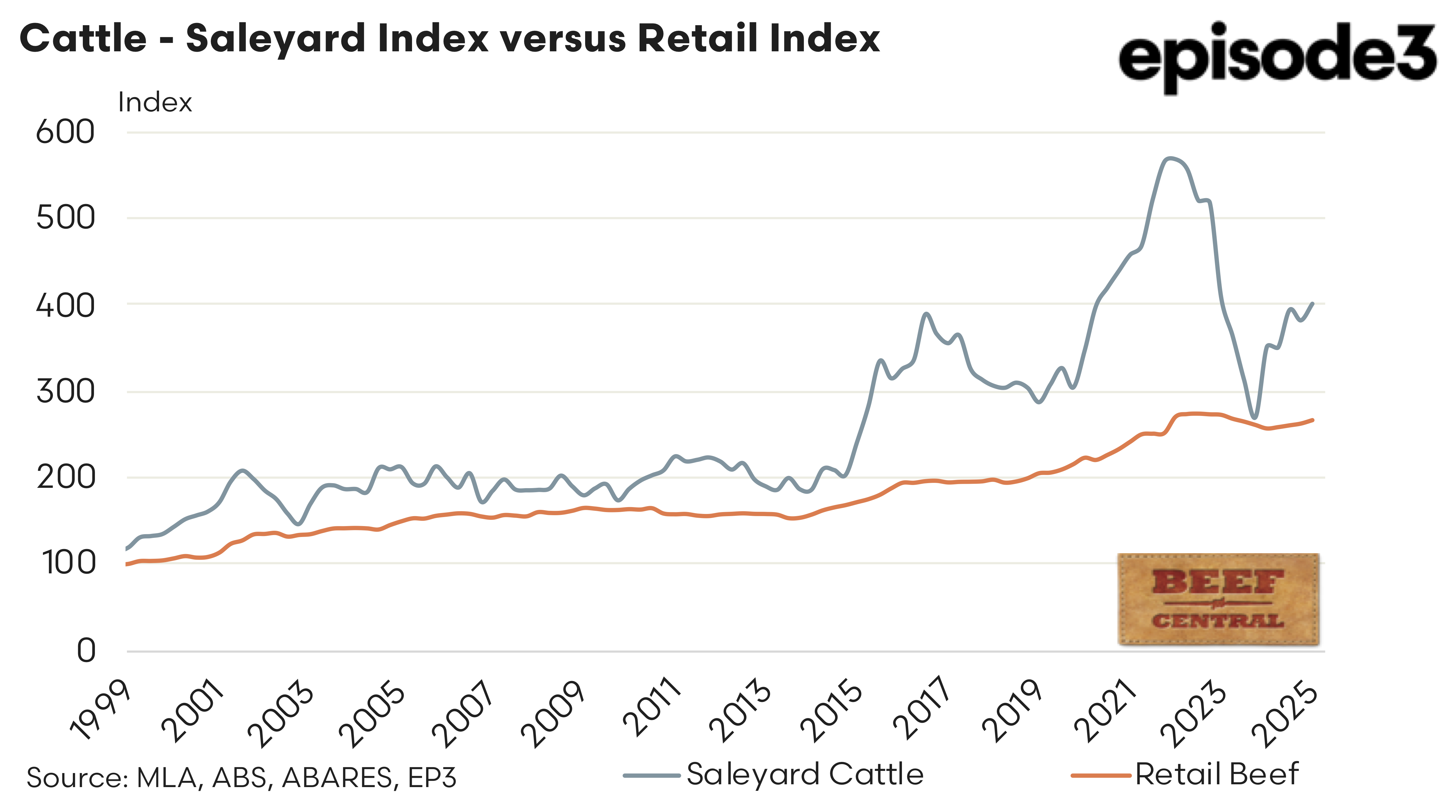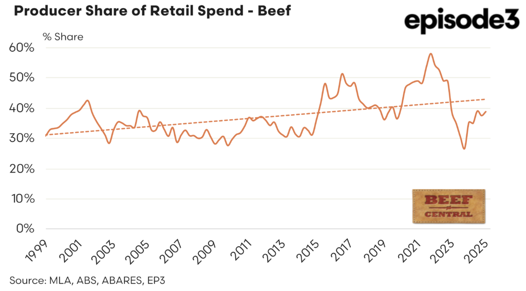 Overall, the start of 2025 brought signs of cautious optimism for cattle producers as both saleyard and retail prices strengthened, improving their share of the retail value. For lamb producers, however, early signals suggest a need to monitor downstream pricing behaviour more closely, as higher retail values are not currently matched by proportionate gains at the saleyard level.