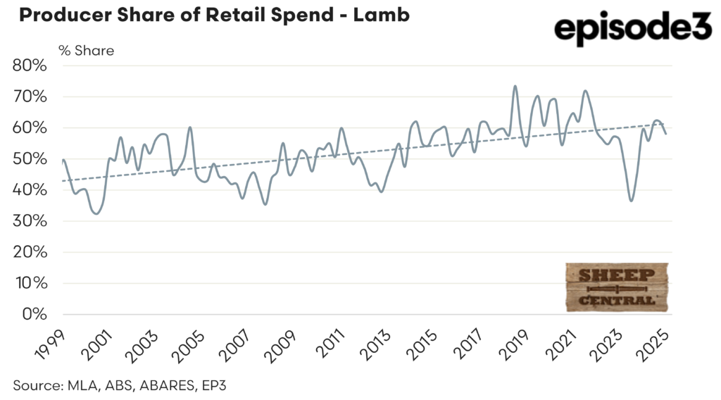 Lamb producers faced a slightly different scenario. While the saleyard price fell marginally from 826 c/kg cwt to 784 c/kg cwt in Q1, retail lamb prices lifted from 19.06 $/kg rwt to 19.27 $/kg rwt. This decoupling led to a reduction in the producer share of the retail lamb value, declining from 61.9% to 58.1%. Although still historically high, this retreat indicates that retail price increases are not fully translating back to farmgate returns, potentially due to margin expansion along the supply chain.