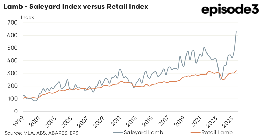 The lamb saleyard index surged to 628 in the September quarter, compared with 480 in June, while the retail lamb index increased to just 320 from 302. The scale of the divergence between saleyard and retail indices is unusually large and underpins the record producer share outcome.