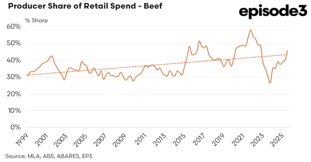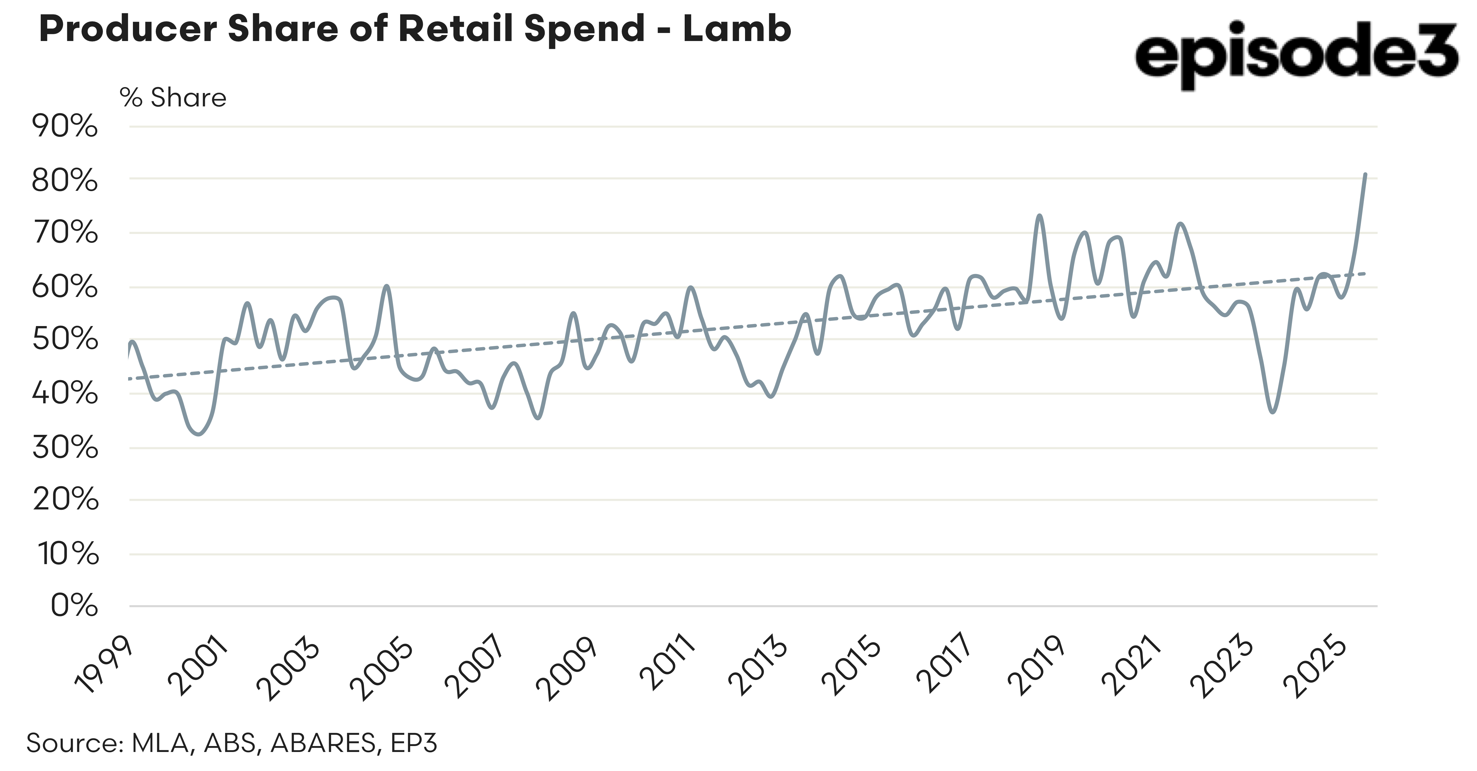 Over the longer term, the lamb producer share series shows a gradual upward trend punctuated by periods of volatility driven by seasonal conditions, flock cycles and shifts in domestic and export demand. The September quarter outcome stands out not only for its level but also for the speed at which it was achieved. It reflects a market environment characterised by constrained supply, strong competition for available lambs and a lag in retail price transmission. While such elevated producer shares are unlikely to persist indefinitely, the current data clearly demonstrates that producers are capturing an unusually large proportion of the retail dollar.