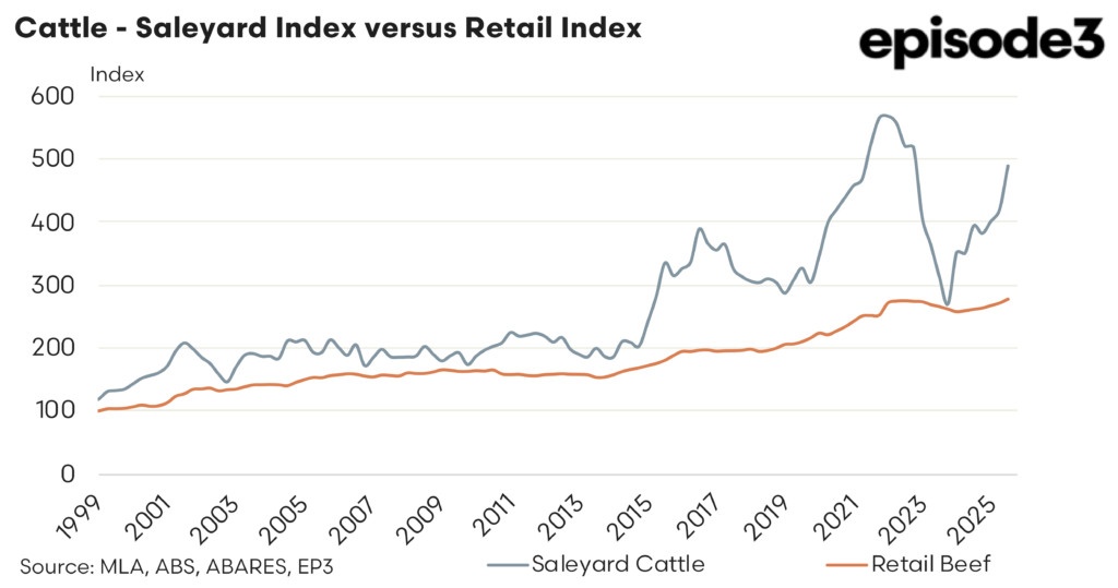 The index series reinforces this trend. The cattle saleyard index rose sharply to 490 in the September quarter, compared with 420 in June and 402 in March. In contrast, the retail beef index increased only modestly to 278, up from 272 in the previous quarter. While producer share remains below the peaks observed during previous cattle cycles, the latest data confirms a clear improvement from the lows recorded in 2024 and points to a more favourable pricing environment for producers as supply tightens and restocker demand strengthens.